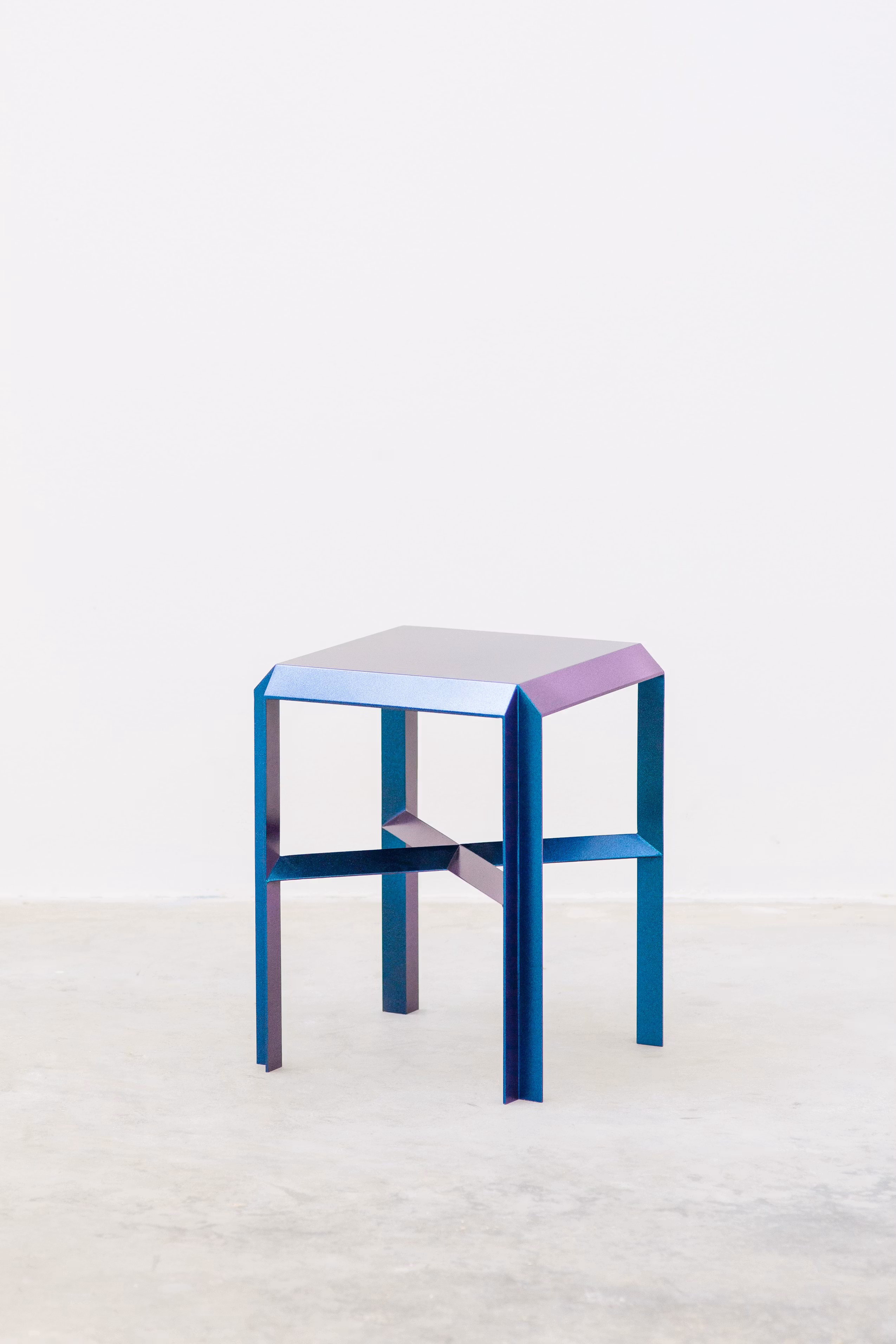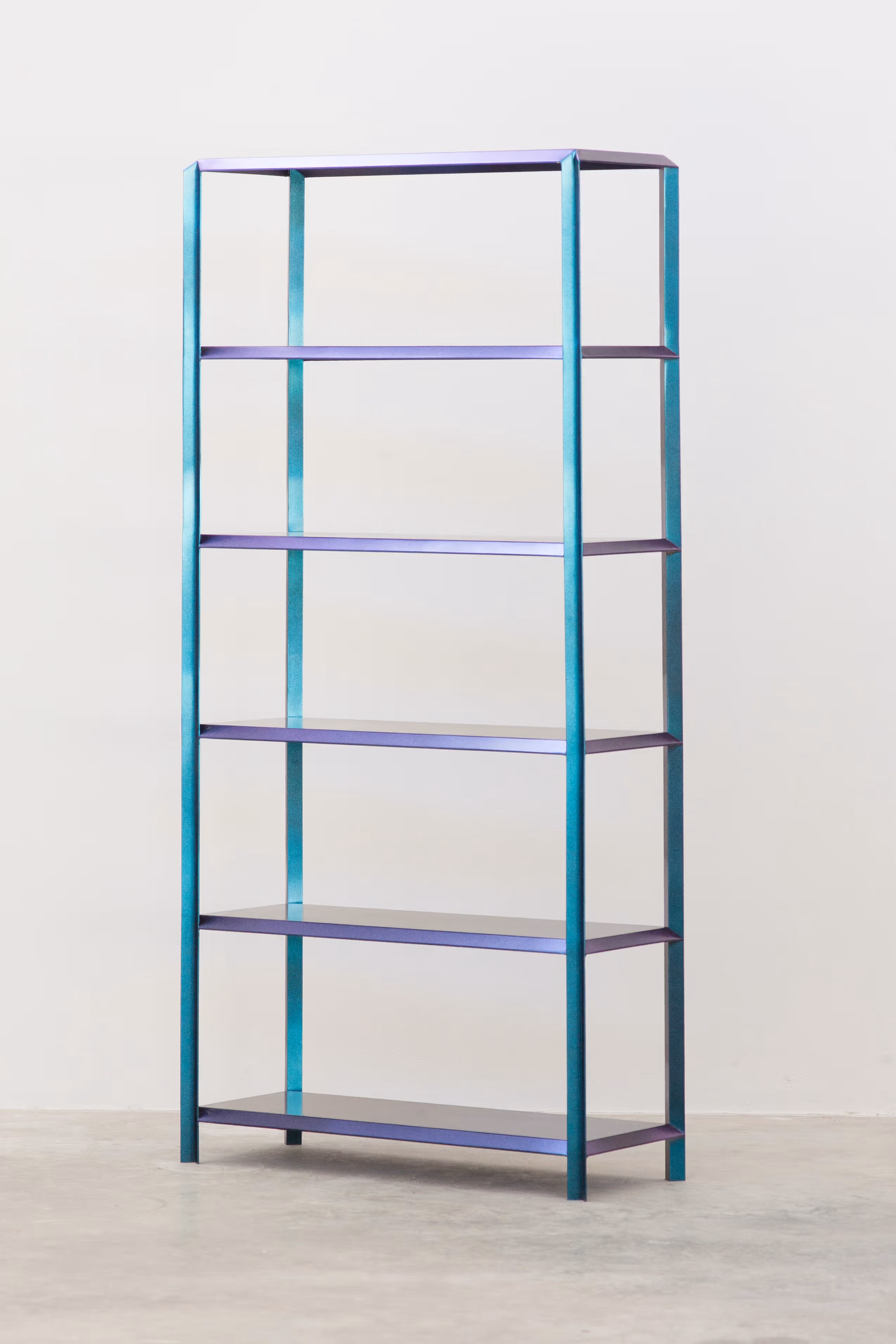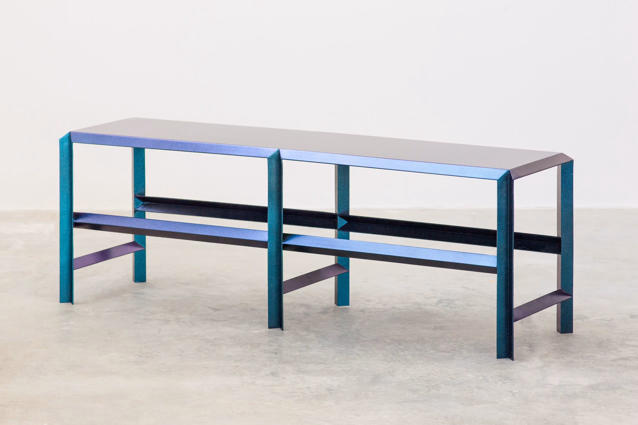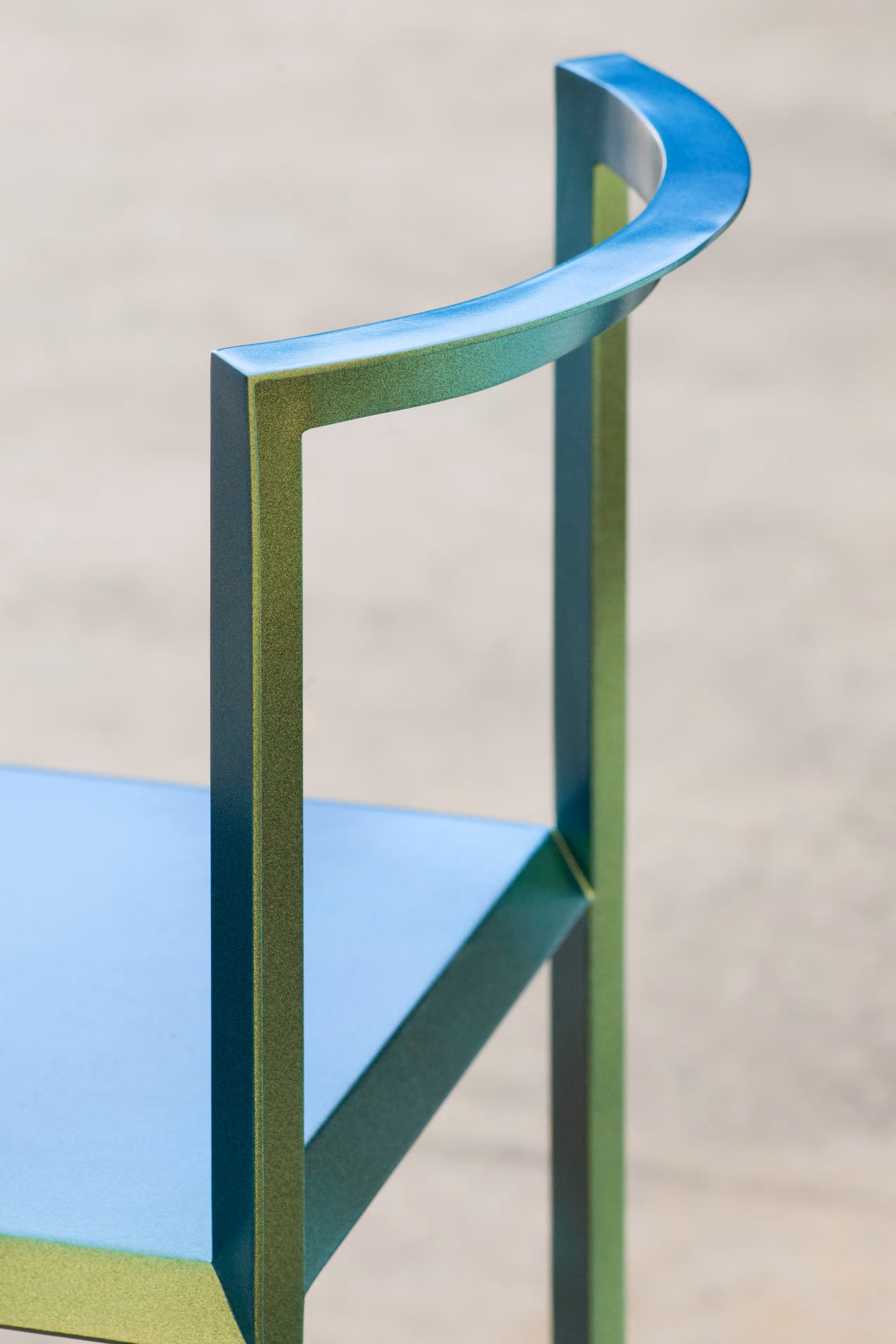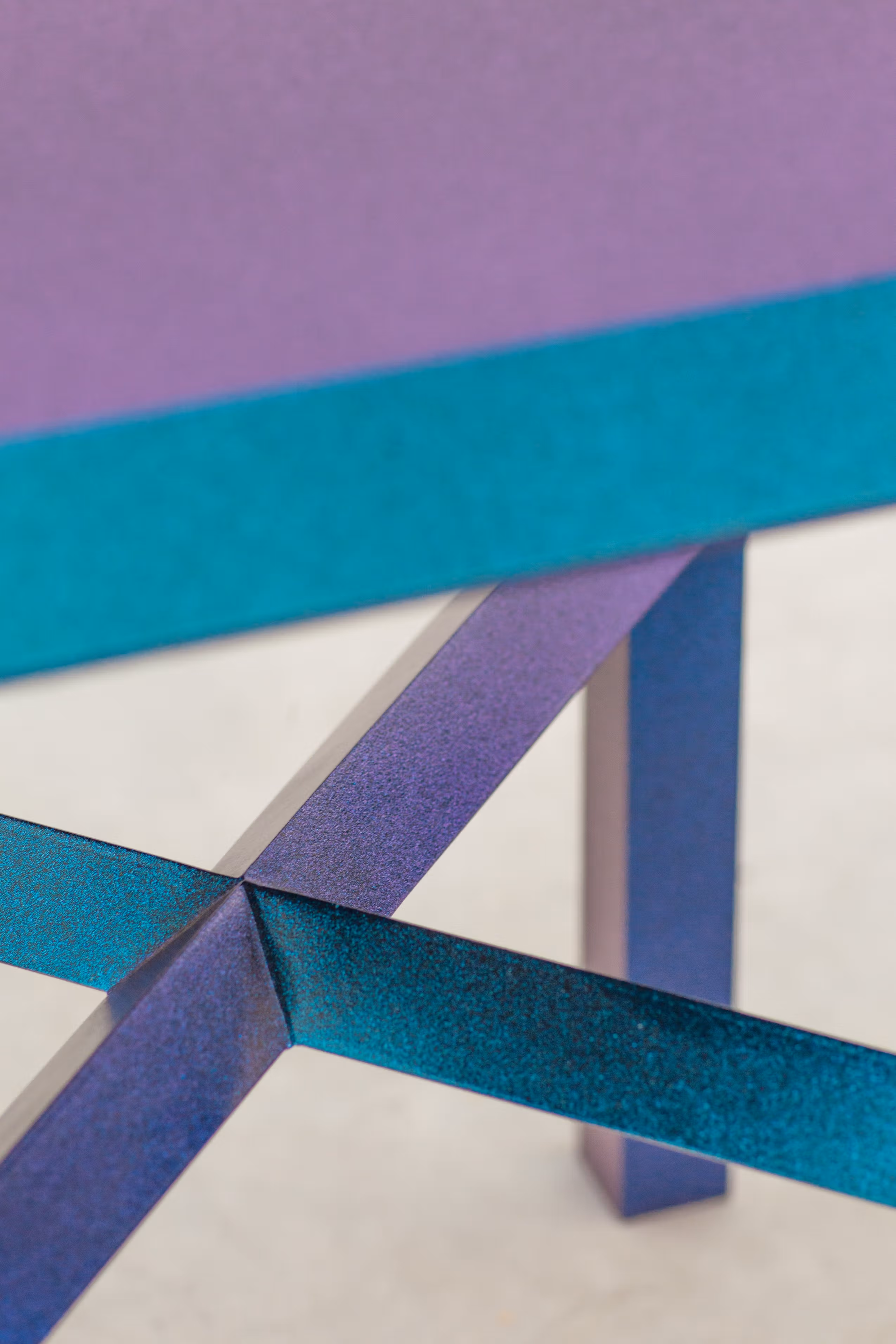 Elle is an idiosyncratic furniture collection developed as a result of extensive research on the use of metal L profiles. The starting point of the research was the willingness to use a common, everyday material to question the meaning of “experimentation” that is often emphasised in today’s design practice. Through different combinations, this standardised extrusion is turned into a structural element, forming “invisible”, yet aesthetically revealing, joints. Rather than being made of aluminium, however, the furniture is made of brass — transforming an ordinary, mass-produced element into a sophisticated, bespoke item. The furniture is coated in holographic paint to further emphasise the interplay between standardised production and craftsmanship — where the objects themselves shift between concrete presence and immateriality. The collection was first developed for the ‘The House Electric’, an exhibition presented in conjunction with the 16th Venice Architecture Biennale 2018. In 2020 the collection was awarded a Wallpaper Design Award in the category of Best Paint. Available for custom-made commissions.