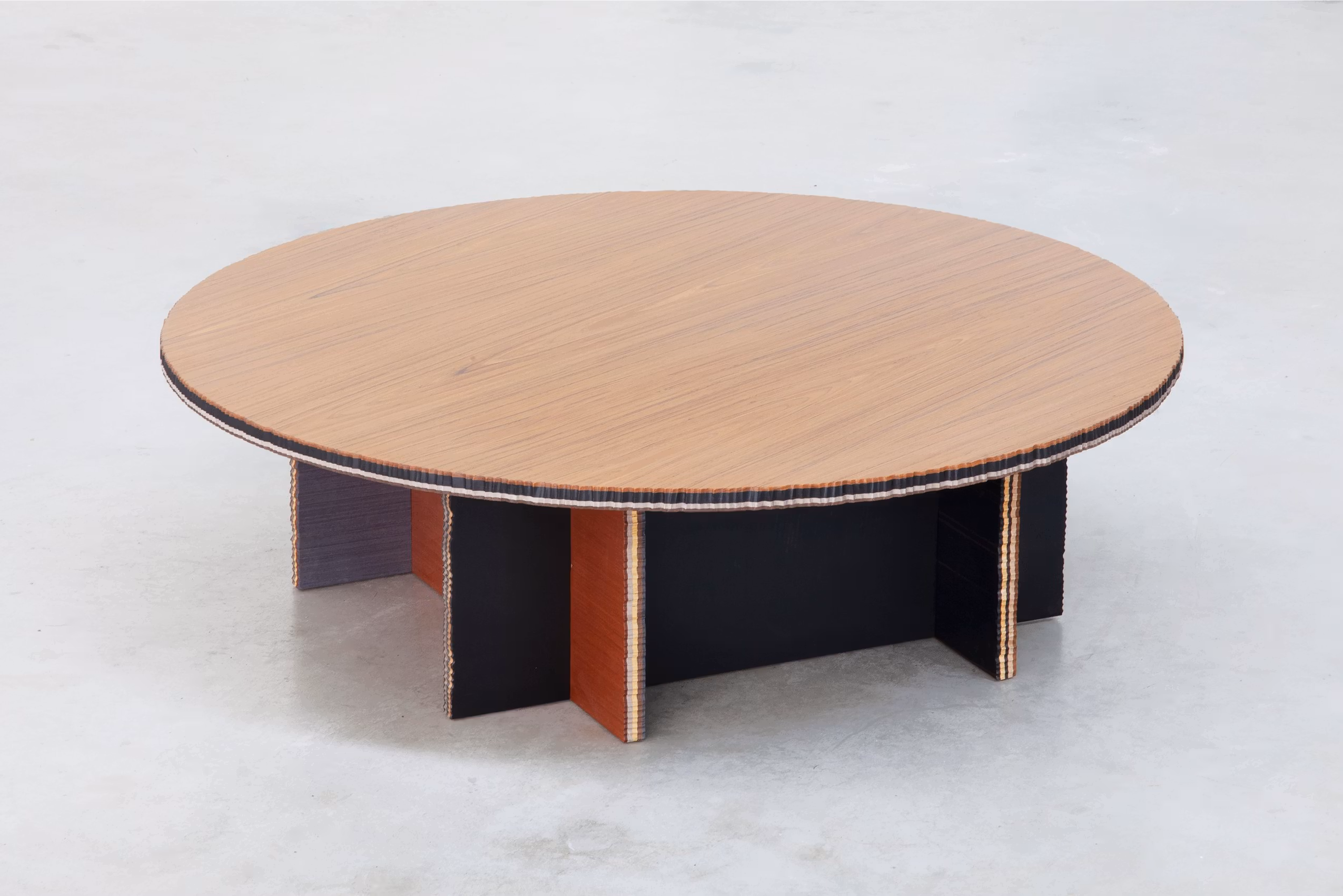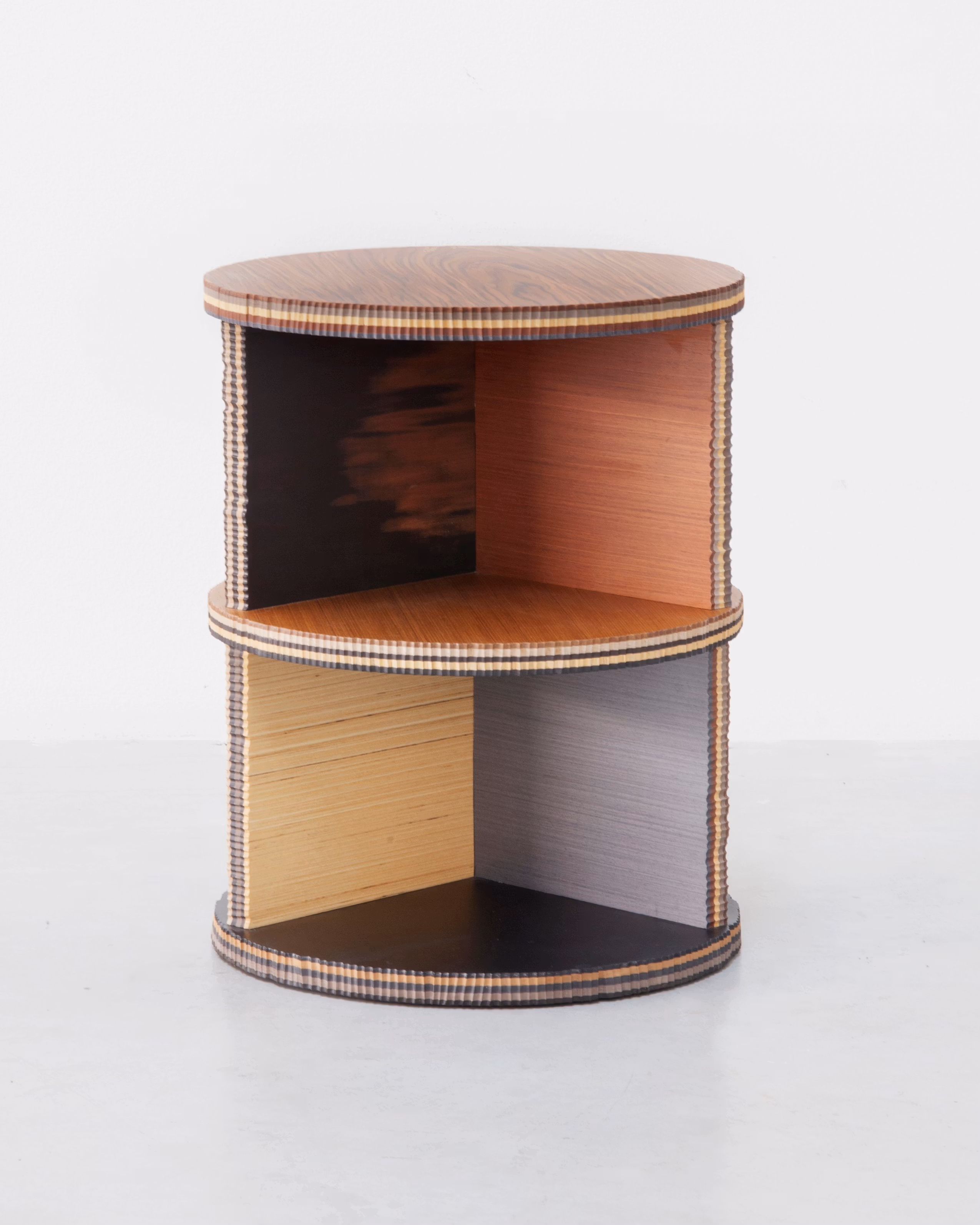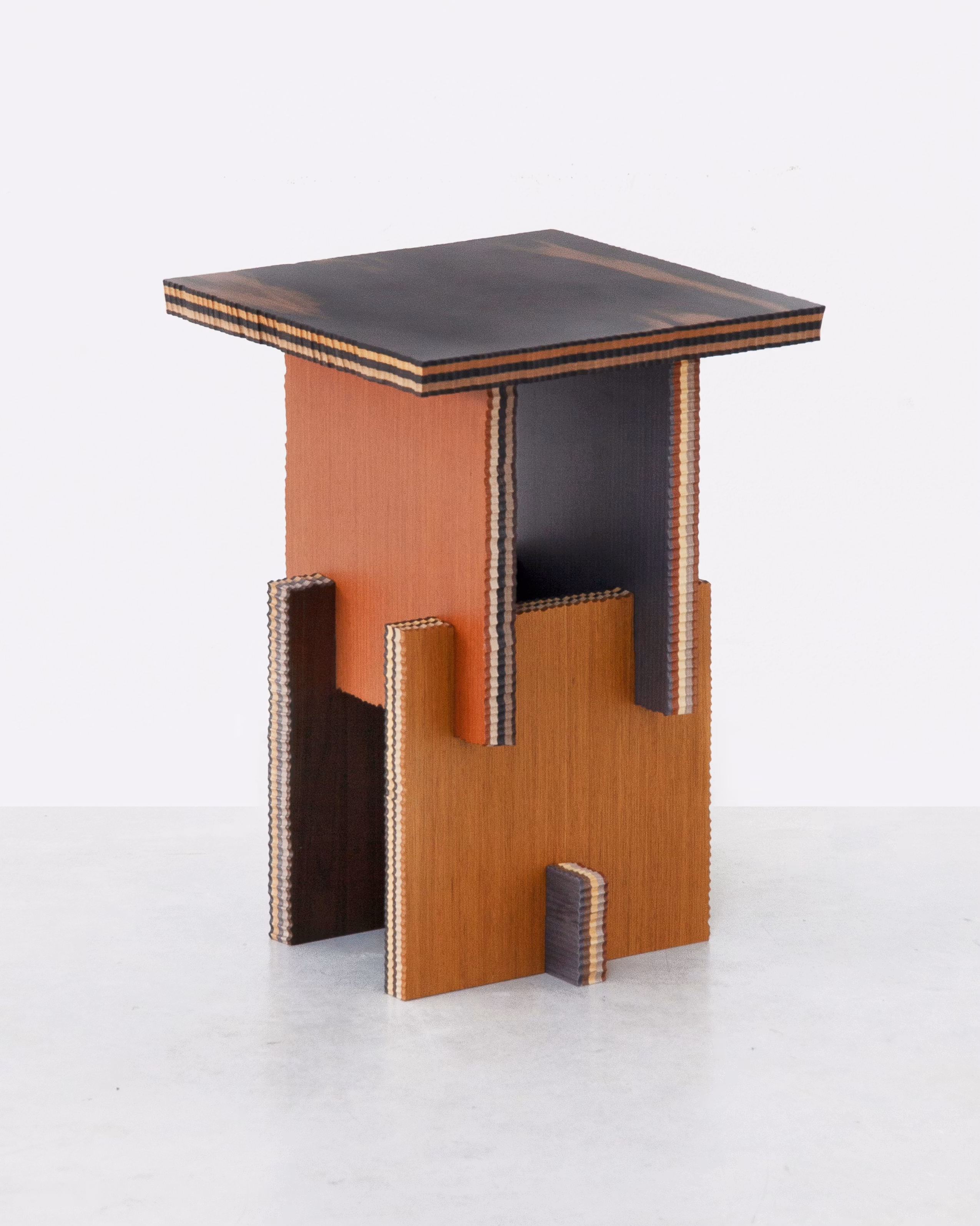 What is the role of waste material in contemporary design production? How can designers rethink the value of objects, materials and processes considered as waste? George is a collection of furniture made from reclaimed sheets of Alpi wood, using pieces discarded through industrial production to create new hand-crafted objects. The discarded scraps – sheets made from different colours and finishes – have been glued together to form a thick block of wood. In this way, sheets that are usually used as surface veneer, become a structural element, inverting the relationship between form and function, decoration and construction. Treating this processed material as a block of timber, the edges of the table were chiselled, as a tongue-in-cheek homage to the great master George Nakashima. These chiselled blocks form an appealing series of stools, coffee tables and dining tables, offering a new aesthetic alternative to solid wood furniture. Inverting the relationship between the natural and the artificial, waste and resource, this project subtly questions the way we value materiality in the digital age. Available for custom-made commissions via email.