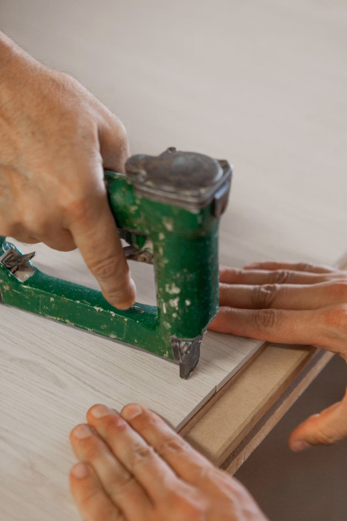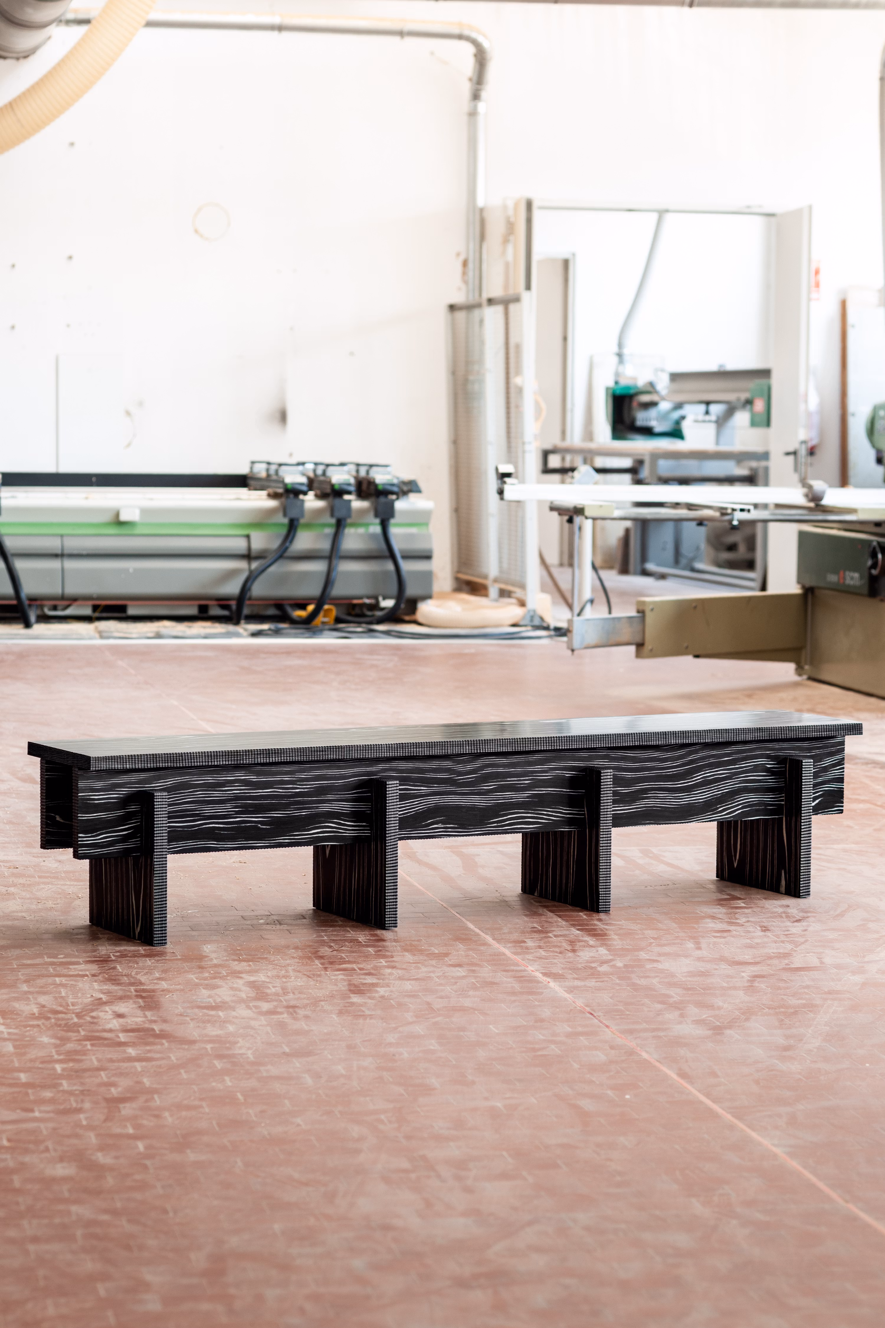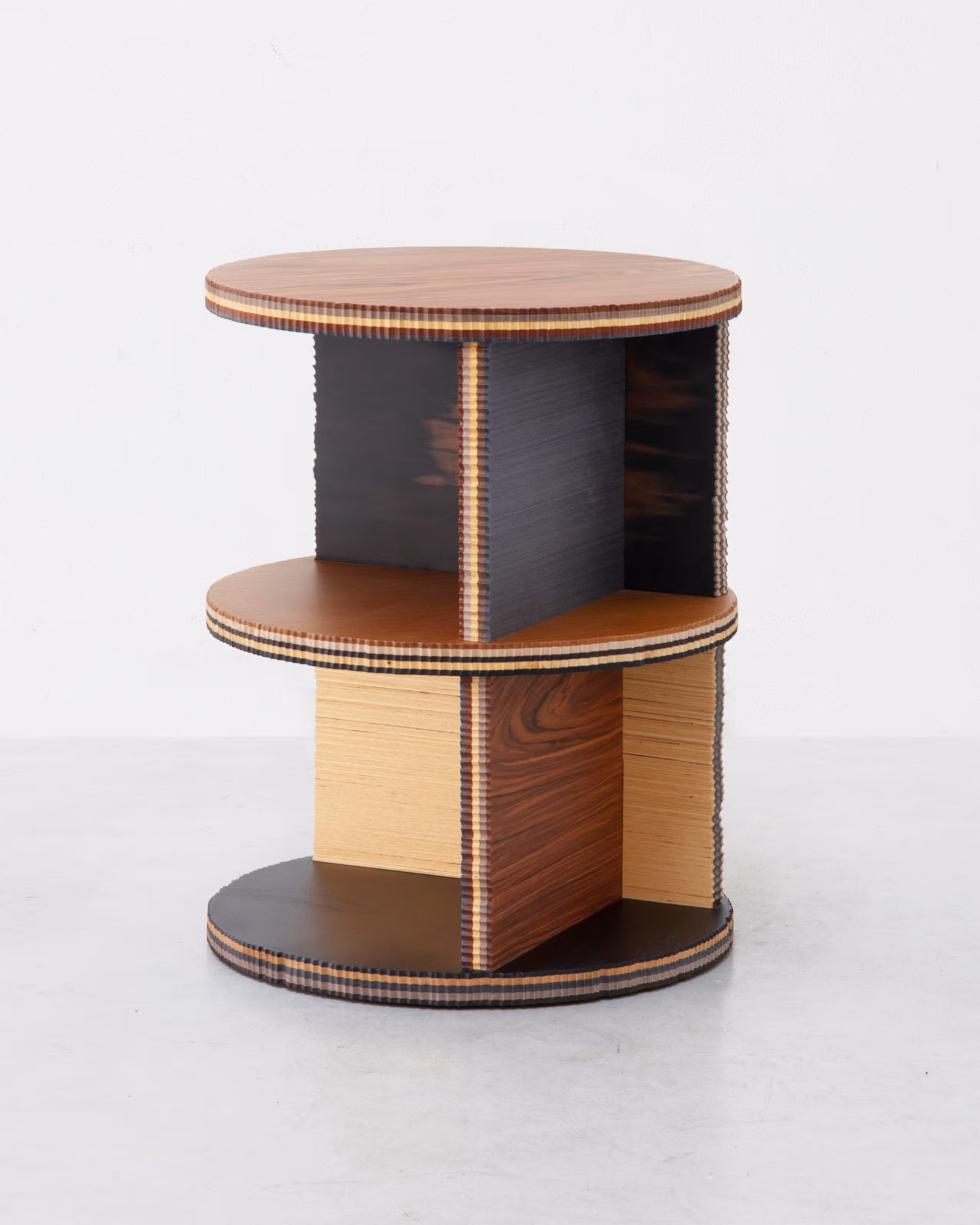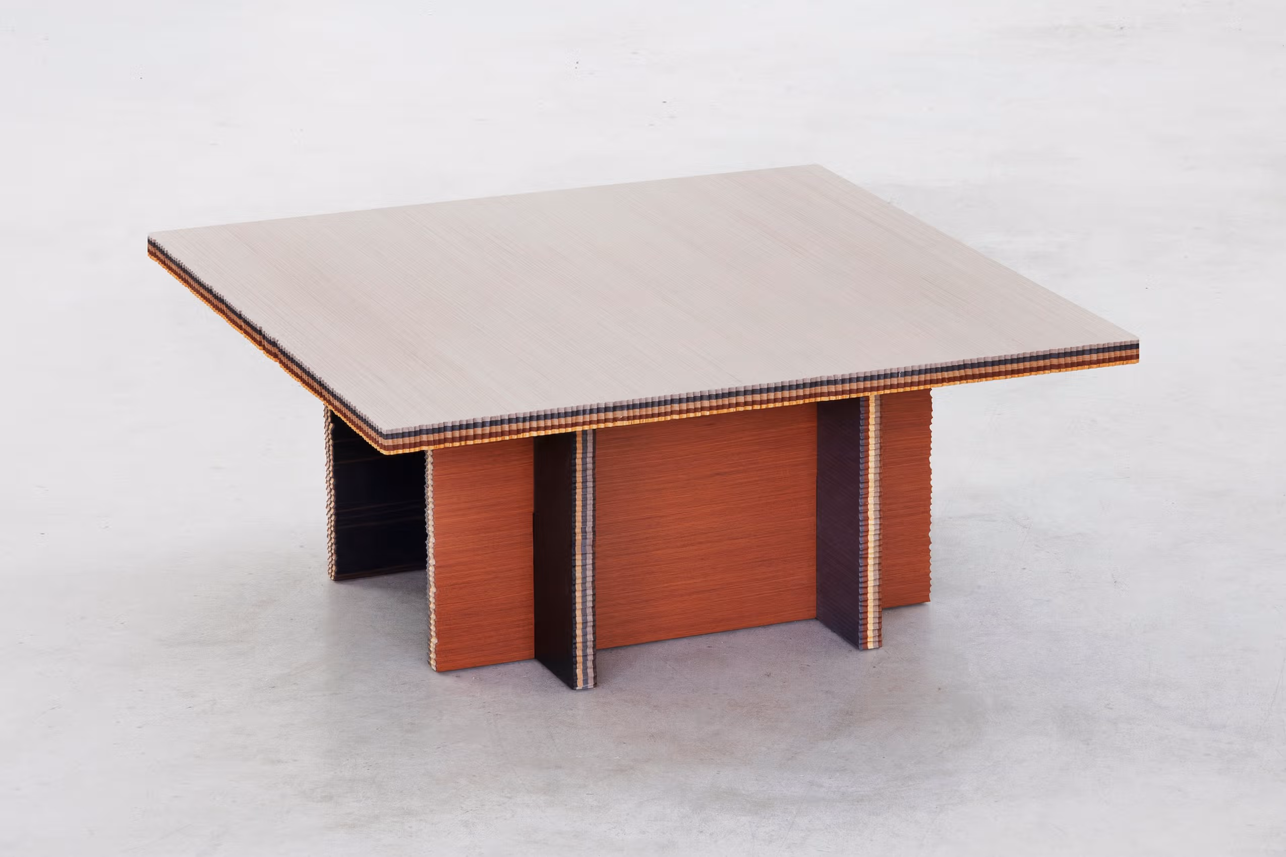 What is the role of waste material in contemporary design production? How can designers rethink the value of objects, materials and processes considered as waste? George is a collection of furniture made from reclaimed sheets of Alpi wood, using pieces discarded through industrial production to create new hand-crafted objects. The discarded scraps – sheets made from different colours and finishes – have been glued together to form a thick block of wood. In this way, sheets that are usually used as surface veneer, become a structural element, inverting the relationship between form and function, decoration and construction. Treating this processed material as a block of timber, the edges of the table were chiselled, as a tongue-in-cheek homage to the great master George Nakashima. These chiselled blocks form an appealing series of stools, coffee tables and dining tables, offering a new aesthetic alternative to solid wood furniture. Inverting the relationship between the natural and the artificial, waste and resource, this project subtly questions the way we value materiality in the digital age. Available for custom-made commissions via email.