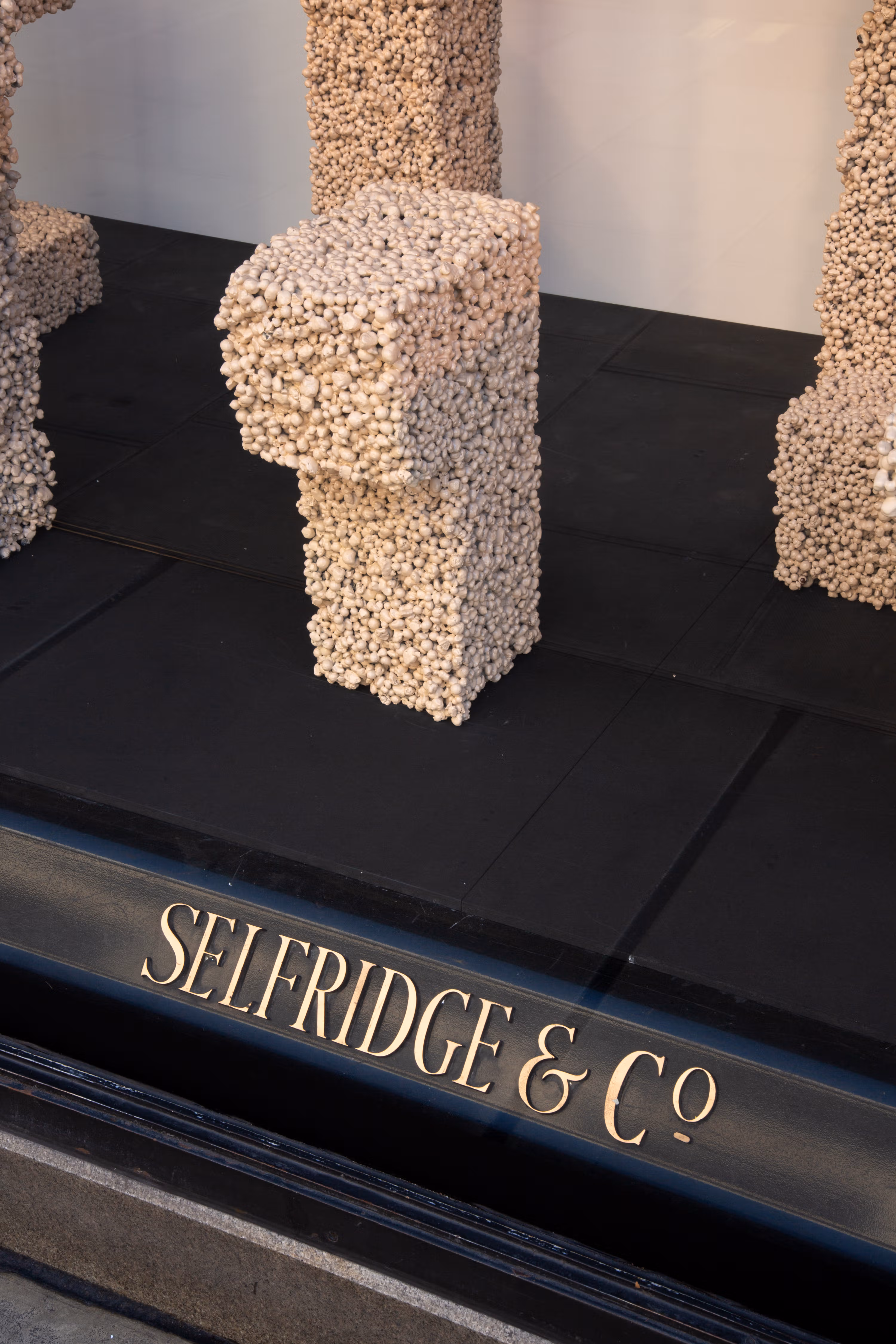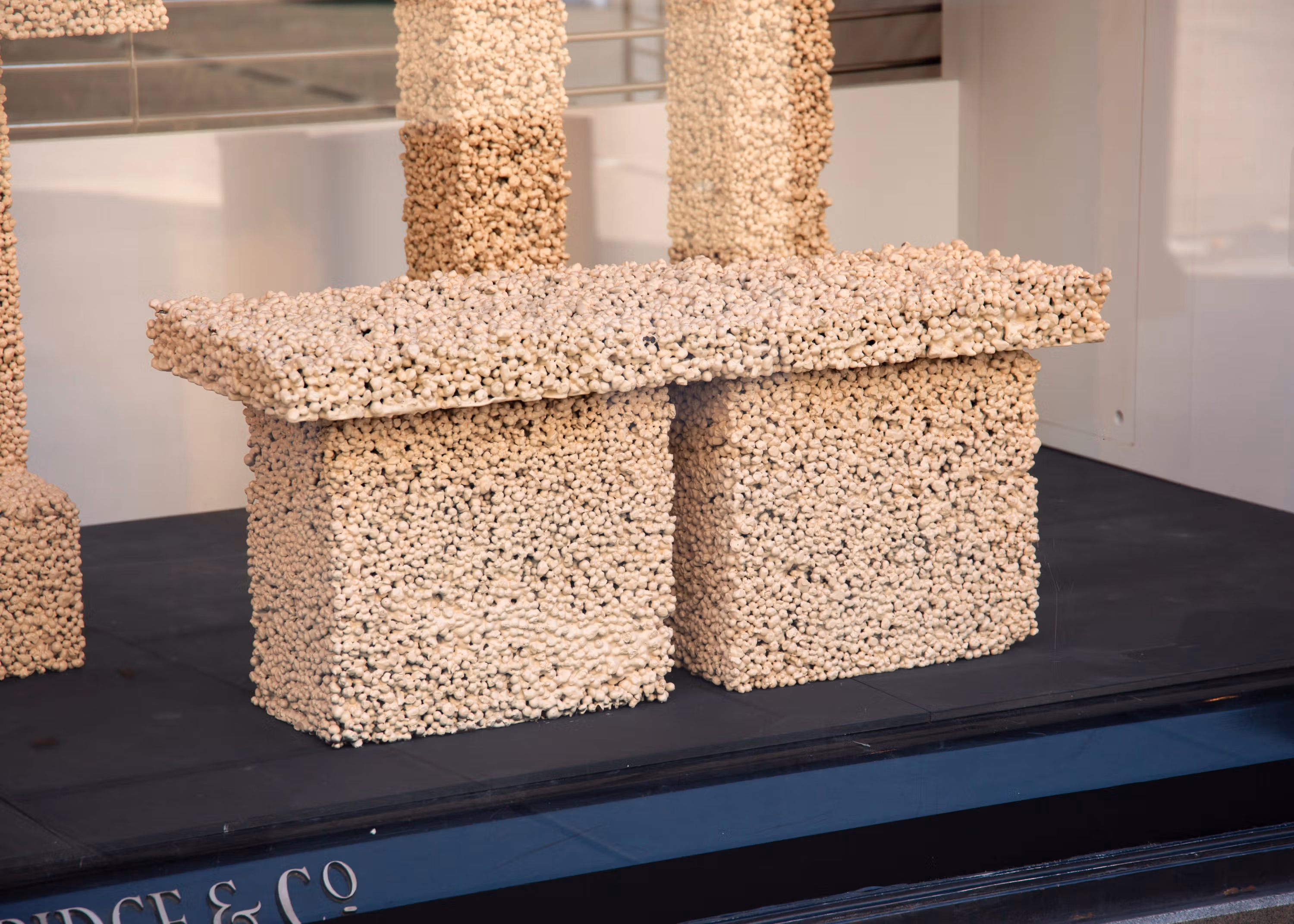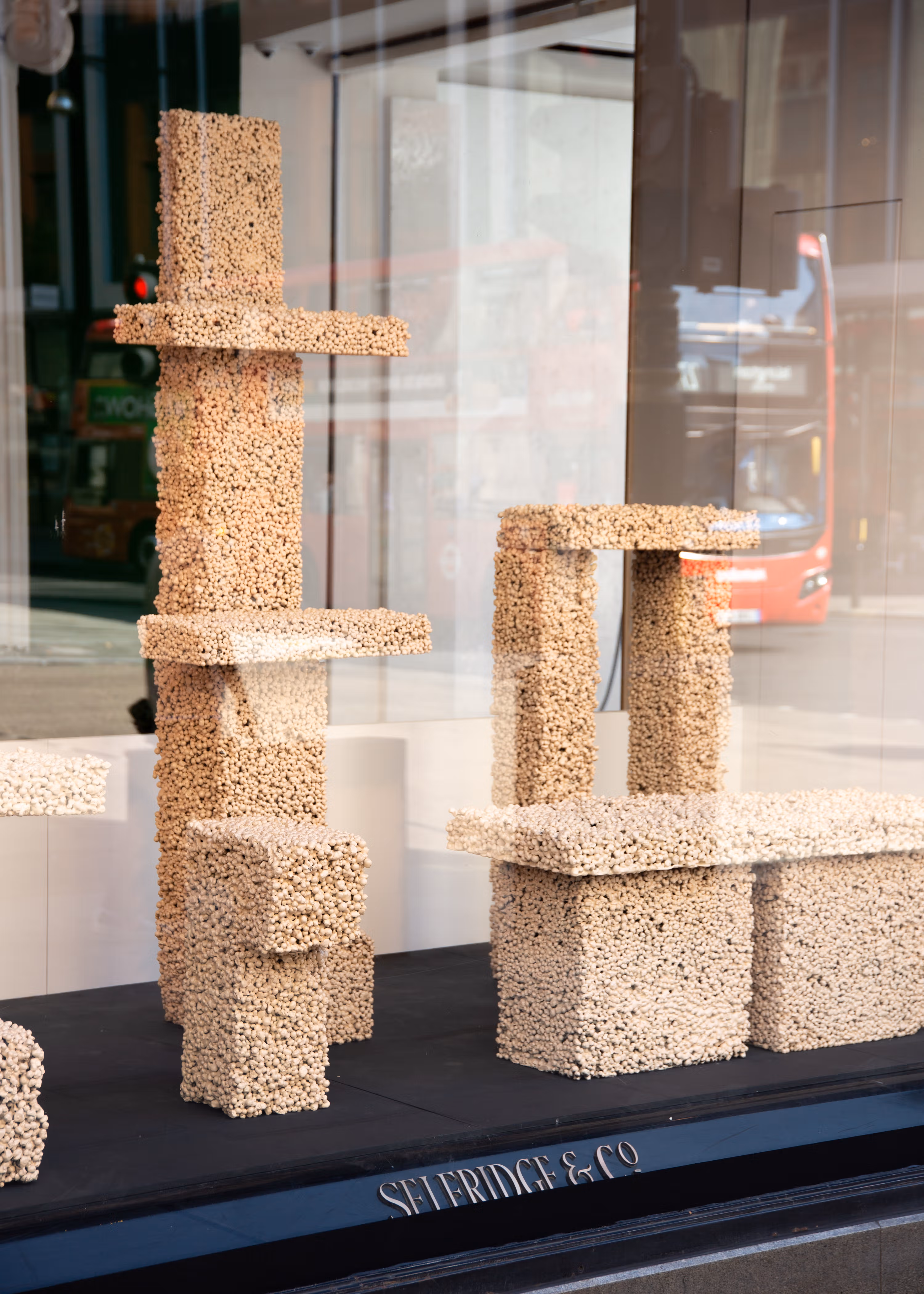 Reversible is a sustainable shopping display exploring the possibilities of circular modes of production. Created as a shop window installation for “Visions for the Future” (SUPERFUTURES) and commissioned by Selfridges, the project can be completely deconstructed to its original components after use by simply using water. Expanded clay is bound together with sugar to form essential sculptures that can be dissolved after use. The installation questions models of mass production, particularly within the context of temporary display design. With a focus on materiality, it proposes an alternative production method where the process of making and the materials themselves determine the final result.